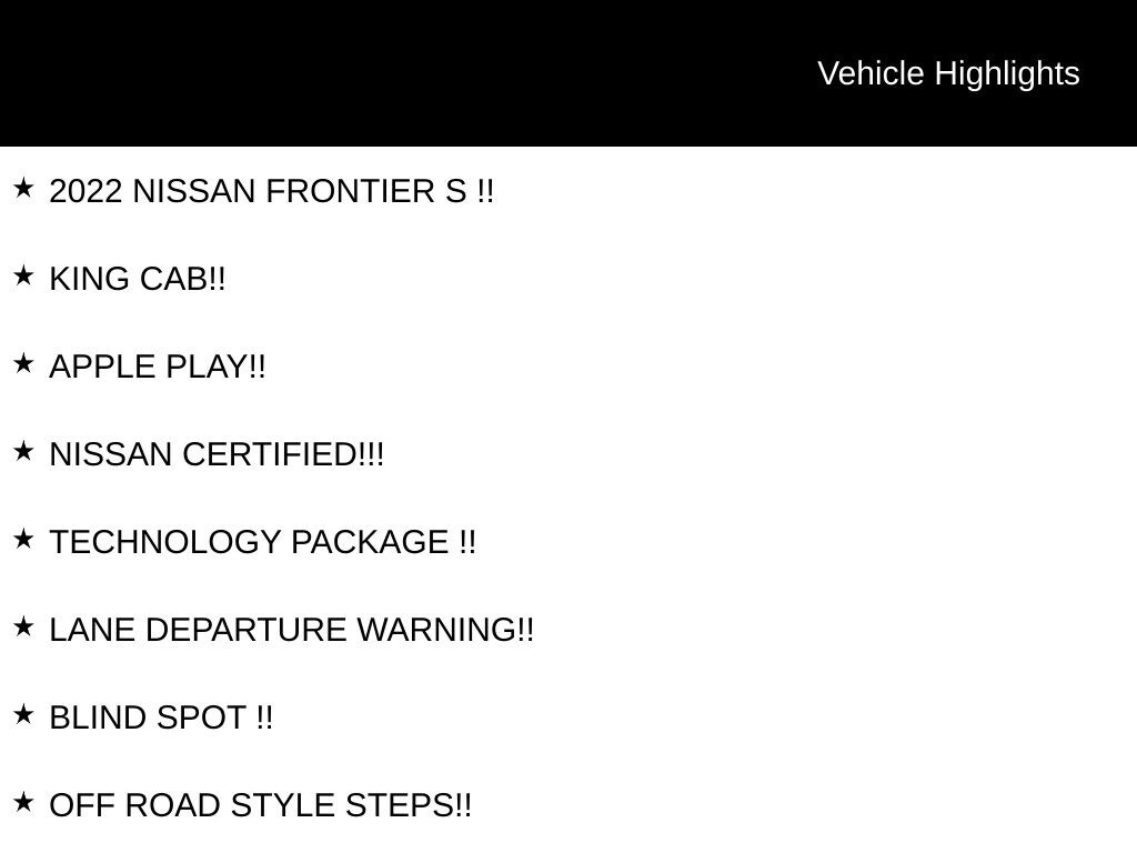 2022 NISSAN FRONTIER S !!, KING CAB!!, APPLE PLAY!!, NISSAN CERTIFIED!!!, TECHNOLOGY PACKAGE !!, LANE DEPARTURE WARNING!!, BLIND SPOT !!, OFF ROAD STYLE STEPS!!, 4WHEEL DRIVE!!, Apple CarPlay/Android Auto, Power steering, Power windows. Certified. Nissan Certified Details: