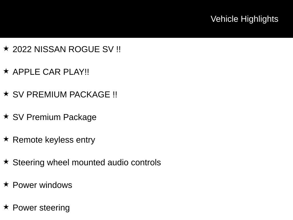 2022 NISSAN ROGUE SV !!, APPLE CAR PLAY!!, SV PREMIUM PACKAGE !!, Front Bucket Seats, Front Center Armrest, Heated door mirrors, Heated Driver & Front Passenger Seats, Heated Leather Wrapped Steering Wheel, Leatherette Door Trim Inserts w/Stitch, NissanConnect featuring Apple CarPlay and Android Auto, Power driver seat, Power Liftgate, Power Panoramic Moonroof, Power steering, Power windows, PRIMATEX Leatherette Seat Trim, Rear Door Sunshades, Rear Personal Lights, Remote keyless entry, Silver Painted Roof Rails, Steering wheel mounted audio controls, SV Premium Package. Certified. Nissan Certified Details: