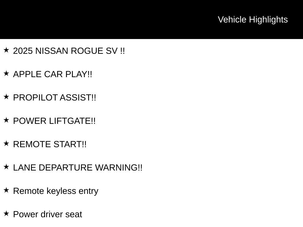 2025 NISSAN ROGUE SV !!, APPLE CAR PLAY!!, PROPILOT ASSIST!!, POWER LIFTGATE!!, REMOTE START!!, LANE DEPARTURE WARNING!!, Bumpers: body-color, Front Bucket Seats with 8-Way Power Driver Seat, Front reading lights, Heated door mirrors, Power door mirrors, Power driver seat, Power Liftgate, Power steering, Power windows, Rear seat center armrest, Remote keyless entry, Spoiler, Tachometer, Telescoping steering wheel, Tilt steering wheel. Certified.
